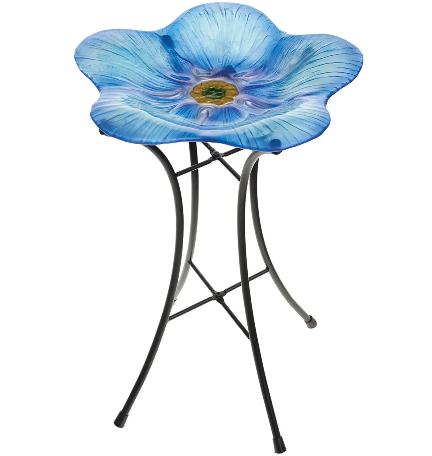 Fågelbad i glas på ställning med handmålat motiv och form av en förgätmigej från Gardman.