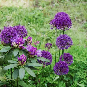 Kirgislök Purple Sensation höjer sig majestätiskt ovanför de andra lökväxterna.
