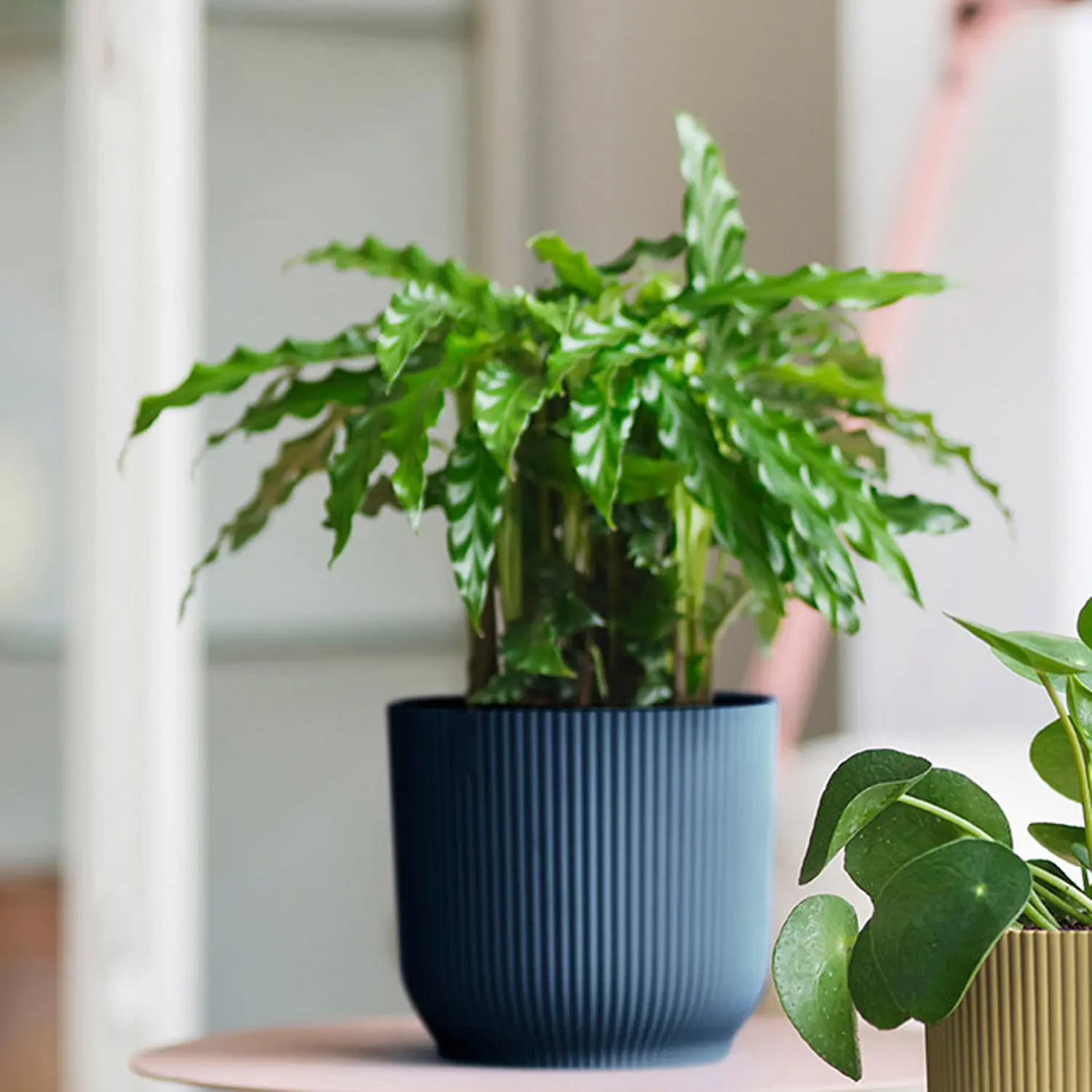 Rund mörkblå ytterkruka 30 cm i serien Vibes Fold med mjuka former och dekorativt vågmönster från Elho utan hål i botten. Ytterkrukan är tillverkad av 100% återvunnen plast av hög kvalité.